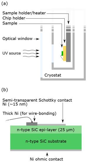 The quality of the SBDs was investigated by current–voltage (I–V) and capacitance–voltage (C–V) measurements. Majority carrier traps were analyzed by means of conventional DLTS and minority carrier traps were measured by MCTS and Laplace-MCTS Figure 1 shows schematic representation of the experimental setup (Figure 1a) and the semi-transparent n-type 4H–SiC Schottky barrier diode (Figure 1b).