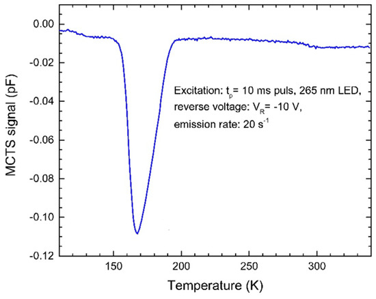 The minority carrier transient spectroscopy (MCTS) spectrum for the as-grown n-type 4H–SiC semi-transparent SBD (emission rate 20 s−1). The optical excitation was carried out with 10 ms pulses of 265 nm LED light. The SBD was kept at the constant reverse bias VR = −10 V.