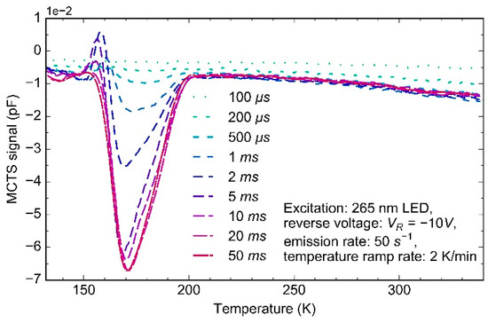 Figure 6 shows selected MCTS spectra for different optical excitation pulse widths. Although the MCTS peaks for the Ev + 0.28 eV trap are broad (Figure 6) for the short pulses (1–2 ms) and exhibit a shape similar to double peaks (two closely spaced peaks), the Laplace-MCTS measurements showed a single emission line (as shown in Figure 6) and did not reveal any new information regarding the Ev + 0.28 eV trap. In addition, a small positive peak in the MCTS spectrum with its peak maximum around 160 K was detected. We were not able to precisely estimate the activation energy of this trap (due to the inconsistent behavior either through the series of Laplace-MCTS measurements at different temperatures or for different optical excitation pulse widths) and it remains unclear is it a majority carrier trap or an artefact of the measurements.
