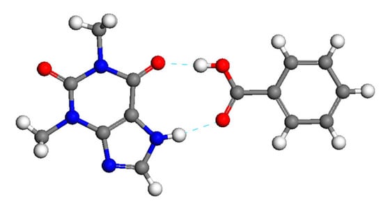 The molecules of theophylline‑benzoic acid (TP‑BA) cocrystal at a stoichiometric molar ratio of 1:1 (grey atoms: C; red atoms: O; blue atoms: N; white atoms: H).