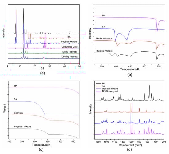 The solid characterization spectra of TP, BA, physical mixture and TP-BA cocrystal: (a) powder X-ray diffraction (PXRD); (b) differential scanning calorimetry (DSC); (c) thermogravimetric analysis (TGA); (d) Raman spectroscopy.
