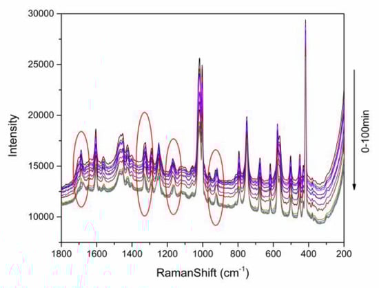The Raman spectra at 200–1800 cm−1 obtained from slurry crystallization at 298.15 K is shown in Figure 4. In this figure, the shifts of the Raman spectra within operating time can be observed. The main shifts ranges are at (1) 1678–1688 cm−1, (2) 1323–1331 cm−1, (3) 1161–1171 cm−1, and (4) 918–925 cm−1, respectively, and are marked with circles in Figure 4, which are corresponding with the off-line Raman spectra of the solid phase of TP, BA and cocrystal. That demonstrates that on-line Raman spectroscopy can be used to monitor the TP-BA cocrystal formation process in slurry crystallization.