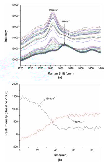(a) The variation of Raman spectra at 1640–1720 cm−1; (b) The change of relative peak intensity of 1678/1688 cm−1 in TP-BA cocrystal formation in slurry crystallization at 298.15 K. The information about the time interval of the Raman spectra are listed in Table S1.