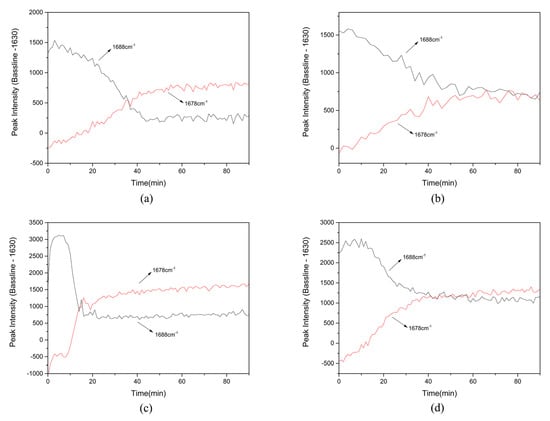 The peak at 1688 cm−1 was chosen as the characterization peak of raw materials in suspension and the peak at 1678 cm−1 was selected as the characterization peak of cocrystal. The relative peak intensity is presented in Figure 6 (the baseline is the same as above). In Figure 6, the total time taken for cocrystal formation in each experiment under different conditions can be obtained and the formation time was 44 min, 57 min, 22 min, and 43 min respectively.