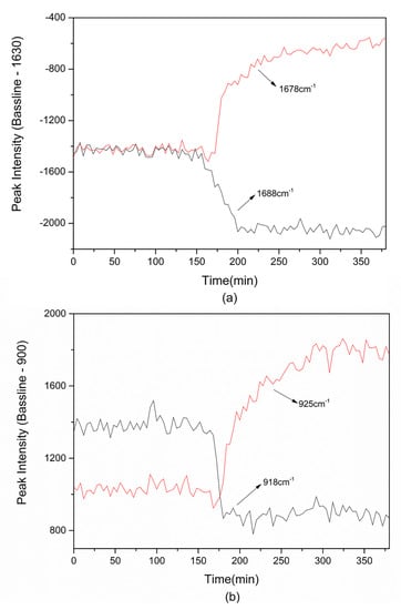 The relative peak intensity during TP-BA cocrystal formation in cooling crystallization: (a) 1678/1688 cm−1; (b) 918/925 cm−1.