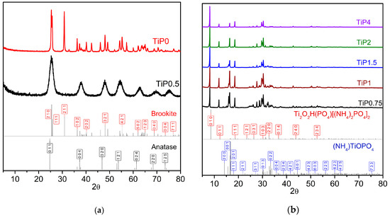To study the formation of titanium phosphates under hydrothermal conditions, we varied the concentration of NH4H2PO4 in the reaction mixture. In all cases, white powders were obtained. XRD patterns are presented in Figure 1. According to powder XRD, the variation in NH4H2PO4 concentration leads to a change in the phase composition of the samples (Figure 1). Without addition of NH4H2PO4 a pure brookite phase formed. This result agrees with Kandiel et al. who obtained this phase under similar conditions [17]. For molar ratio Ti:NH4H2PO4 = 1:0.5 in the reaction mixture, the anatase phase formed. For higher NH4H2PO4 concentrations, both (NH4)TiOPO4 and Ti2O2H(PO4)[(NH4)2PO4]2 were present in the system. The TiP2 and TiP4 samples contained a single phase Ti2O2H(PO4)[(NH4)2PO4]2, whereas TiP0.75, TiP1, and TiP1.5 contained an (NH4)TiOPO4 impurity (Figure 1, Table 1). The relative intensity of the (NH4)TiOPO4 phase reflections decreases along the TiP0.75-TiP1-TiP1.5 series, which reflects an increase in the fraction of Ti2O2H(PO4)[(NH4)2PO4]2 in the reaction products. In previous studies, the Ti2O2H(PO4)[(NH4)2PO4]2 phase also formed in the presence of excess phosphate and ammonium ions [22,23]. Khainakova et al. prepared this phase using TiCl4 as the titanium-containing precursor, H3PO4 as the P source, and urea as the ammonium source [22]. In [23], Ti2O2H(PO4)[(NH4)2PO4]2 was formed under hydrothermal conditions from amorphous titanium oxide in the presence of (NH4)2HPO4. Our results indicate that titanium lactate can also be used as a precursor for Ti2O2H(PO4)[(NH4)2PO4]2 and the synthetic procedure suggested in the present study is very flexible and enables the generation of three pure phases, anatase, brookite, and Ti2O2H(PO4)[(NH4)2PO4]2, by adjusting the phosphate concentration in the correct ratio.