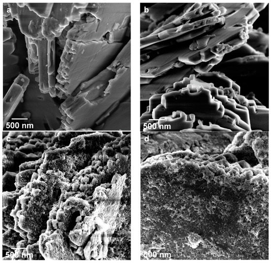 Plate-like particles formed in the samples with Ti:P ratios higher than 0.75 (Figures S2–S6). For all phosphate concentrations, the thickness of the plates was from 0.2 to 0.5 μm and the lateral size was about 3.6–9.3 μm (Table S2). The thickness and lateral sizes of the particles tend to decrease with the increase of phosphate concentration in the reaction mixture. The plate-like morphology observed in Ti2O2H(PO4)[(NH4)2PO4]2 phase was also described in [22]. With increasing concentrations of phosphate ions and decreasing of (NH4)TiOPO4 content the surfaces seem to become smoother. The samples TiP4 and TiP2, which contain only Ti2O2H(PO4)[(NH4)2PO4]2 phase consist of smooth plate-like particles (Figure 4a,b, Figures S2 and S3), so this phase has a smooth plate-like morphology. In the samples TiP1 and TiP0.75 the plate-like particles are covered by small particles (Figure 4c,d, Figures S5 and S6). According XRD analysis these samples contain (NH4)TiOPO4 impurity, so (NH4)TiOPO4 phase consists of small particles which cover Ti2O2H(PO4)[(NH4)2PO4]2 plates. TiP1.5 sample also contains (NH4)TiOPO4 according XRD, but small particles of this phase are not clearly seen in SEM images (Figure S4), probably, because of low content of this phase in the sample.