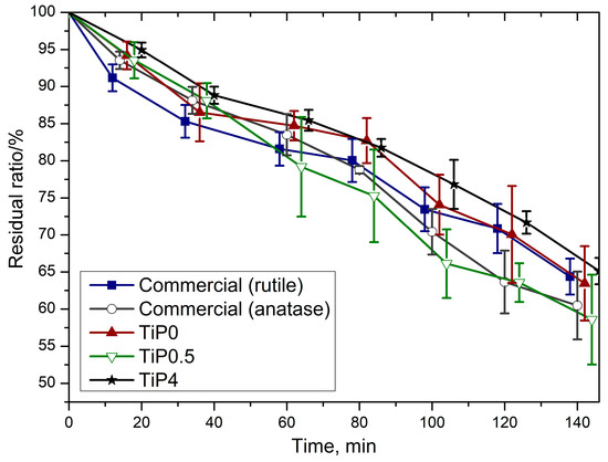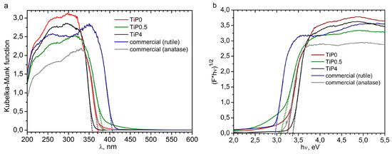 where R is reflectance. By plotting (F·hν)1/2 for indirect allowed transitions vs. hν (where hν is photon energy), the optical band gaps of the semiconductor samples were obtained. The optical band gap for Ti2O2H(PO4)[(NH4)2PO4]2 was found to be 3.37 eV. It is not clear if Ti2O2H(PO4)[(NH4)2PO4]2 is a direct or indirect semiconductor. The graph was plotted in coordinates (F·hν)2 vs. hν and the energy of direct transition was found to be 3.53 eV (Figure S7). For the pure brookite and commercial rutile samples, the band gap values agree well with those in the literature [27]. For the commercial anatase and TiP0.5 samples, which also includes anatase, the optical band gaps were found to be at 3.23 and 3.09 eV, respectively. In the literature, the optical band gap for anatase varies from 3.09 to 3.2 eV [27,28,29,30]. This discrepancy cannot be explained by the quantum size effect because the exciton radius in anatase is very small [28,29]. However, the formation of energy levels due to defects in anatase crystalline structure may shift the absorption edge and could cause the apparent change of the band gap.