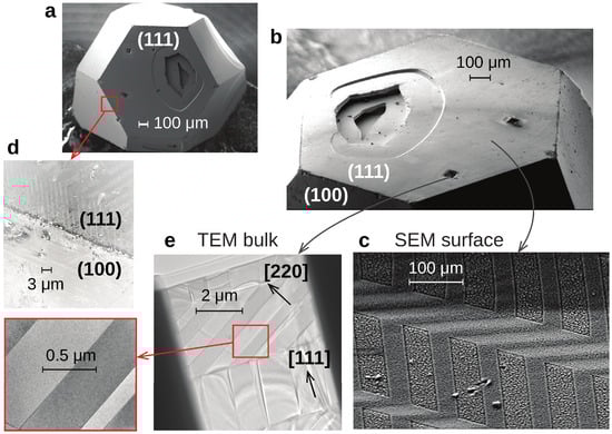 We start the characterization of the bulk crystals by discussing scanning electron microscopy. Figure 1a,b displays the investigated GeTe bulk crystal showing typical faceting, as expected for the slightly rhombohedrally distorted rock salt crystal structure, with pronounced (111) and (001) facets. When zooming in on the (111) facets (Figure 1c “SEM surface”), a clear contrast pattern appears which we associate with the ferroelectric domains which typically arrange in the observed herringbone pattern [44,45]. The edges of the domains on the surface of the crystal are typically aligned parallel or perpendicular to the corners of the respective (111) facet, i.e., along a or a direction. In contrast to the (111) facets, no contrast associated with the domain pattern can be detected on the (100) facets (Figure 1d). In order to study how the domains propagate into the depth of the crystal, lamellae were cut by a focused ion beam. A transmission electron micrograph of a cross sectional lamella labelled “TEM bulk” is shown in Figure 1e and shows that the domain pattern from the surface propagates only around 1 m into the crystal before it changes. Deeper inside the material, domains with various orientations are found.