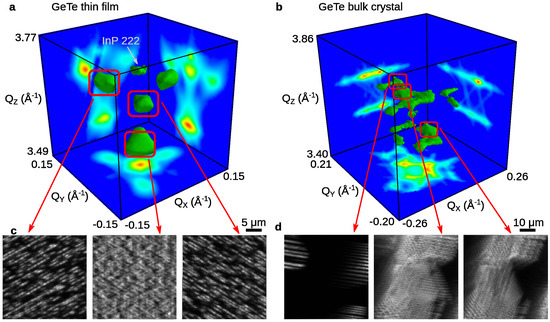 From the electron micrographs, it is not a priori clear what the polarization axis in the specific domains is. Since it is well established that the FE polarization axis is defined by the distortion axis of the rhombohedral crystal distortion [12,13], X-ray diffraction can be used to determine the polarization axis. In Figure 2, scanning X-ray diffraction data are shown for GeTe bulk crystal and thin film samples. Panels (a) and (b) show three-dimensional reciprocal space maps of the GeTe 222 Bragg peak. The data are obtained using a nano-focused X-ray beam, however, shown here is the sum obtained from data collected over an area of 20 m × 20 m and 40 m × 40 m for the thin film and bulk crystal, respectively. Multiple peaks of GeTe originate from rhombohedral distorted domains showing a different distortion axis with respect to the crystal surface. Since both the bulk crystal and thin film were measured on a (111) surface, the distortion axes are either nearly perpendicular to this surface or enclose an angle of roughly 70. This results in two groups of diffraction peaks which show up at lower momentum transfer (increased lattice spacing perpendicular to the surface) or higher momentum transfer (decreased lattice spacing). For the epitaxial thin film, the substrate induces a preference for the domains with distortion axis along the (111) surface normal seen by the fact that the peak at the lowest position is the strongest one. In agreement with earlier studies [6,46], three additional peaks appear which correspond to domains which have the distortion axis along one of the oblique directions of the substrate. On the other hand, for the bulk crystal, where no reference crystal enforces a particular orientation of the domains with respect to each other, the reciprocal space maps are more complicated and even the domains at lower Q-position split into multiple peaks.