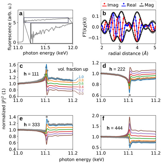 In the simulation, we use the well-known approximation of the Thomson (classical) form factors by a sum of four Gaussians [38]. The energy dependent dispersion (Hönl) corrections can be decomposed into a smooth part related to the isolated atom and an oscillatory part (the fine structure) that depends on the chemical environment of the atom and becomes important close to its absorption edges. Since there is only one unique resonant atom in the crystal structure, the imaginary part can be directly extracted from the EXAFS data. The smooth parts of and can be taken from databases [39,40]. The fine structure for was then obtained using the Kramers–Kronig relations applied to the spectra of [41]. Finally, the simulated energy dependence was convoluted with the energy resolution function, for which we used a Lorentzian function with the full width at half maximum of 1 eV.