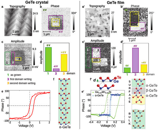 The domain structure in the near surface region in our crystals and films is certainly different, which is evident from the different surface topographies as seen in Figure 4a,a′. It turns out that the crystal surface seen in the micrographs of Figure 1 was not suitable for AFM/PFM measurements. Furthermore, the crystals cannot be cleaved (GeTe has no natural cleavage plane), and are too soft (ductile) to crack at room temperature. For this reason, data seen in Figure 4a–c were measured from a surface obtained by cracking the GeTe crystal at ≈22 K by using a knife-edge holder. We managed to crack the surface along the (111) plane because, as seen in Figure 1, this is the only crystallographic orientation in which the herringbone domain structure can be observed (see Figure 4a). In agreement with our earlier angle-resolved photoemission studies from GeTe films [6], the cracked surface was Te-terminated, as schematically depicted in the simplified model in Figure 4f. On the other hand, the GeTe surface from films had a protective Te and Se cap, which was removed by annealing at 270. The resulting surface relaxation depicted in Figure 4f′ was found to be consistent between photoemission experiments and related theoretical simulations [6,22,23,25].