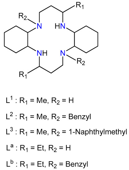 - Kang, S.G.; Kweon, J.K.; Jung, S.K. Synthesis of new tetraaza macrocyclic ligands with cyclohexane ring and their Ni(II) and Cu(II) complexes. Bull. Korean Chem. Soc. 1991, 12, 483–487. [Google Scholar]