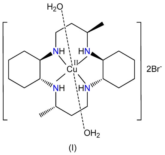- Choi, J.-H.; Clegg, W.; Harrington, R.W. Crystal structure of [2,13-dibenzyl-5,16-dimethyl-2,6,13,17-tetraazatricyclo(14,4,0,07.12)docosane]copper(II) diperchlorate. J. Chem. Crystallogr. 2010, 40, 80–84. [Google Scholar] [CrossRef]