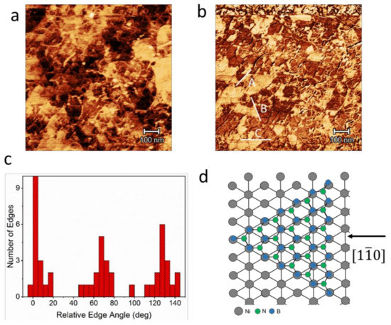 The hexagonal symmetry and close lattice matching with hBN make Ni (111) an ideal surface for growth of hBN. To investigate crystallographic alignment between the hBN layer and the Ni substrate we take advantage of the triangular geometry of hBN islands. Under N-rich conditions hBN will form triangles with zig-zag edges separated by 60° as opposed to hexagons due to the lower energy compared to the hexagonal geometry of an alternating B—N terminated edges. Using X-ray φ-scans we begin by orienting the in-plane orientation of the Ni (111) to a substrate edge. Then using this reference, we align the AFM scan direction perpendicular to the Ni [1,2,3,4,5,6,7,8,9,10] and image the surface in order to observe these sub-nanometer thick features [20]. AFM height map of these features is shown in Figure 2a. The edges of the structures are difficult to discern due to the relative roughness of the Ni surface. For this reason, we instead use the respective phase data taken concurrently with the height map, which is shown in Figure 2b. From this we are able to obtain an alignment histogram (Figure 2c) based the edges of the visible island. The three edge features of the hBN triangles are highlighted in Figure 2b. From the histogram we see there are only three orientation of edges clustering at 60° spacing. Using our reference point for the Ni(111), we find the zig-zag edges of the hBN triangles align with Ni <110> confirming the alignment between hBN and the substrate. Figure 2d shows a schematic of this alignment. Within the measured angles we find a spread of < 10° around each orientation, which could be due to measurement error or misalignment between hBN layers as discussed below.