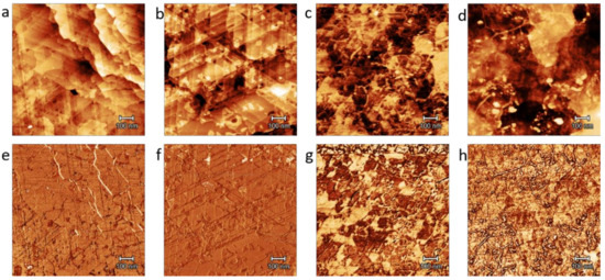 As can be seen in Figure 3, AFM analysis of the films shows highly aligned, nearly indistinguishable films grown on the Ni substrates for short growth times (Figure 3a). However, after 15 min. of growth the film becomes visually distinct, resulting in triangular grains being pronounced from the surface of the substrate (Figure 3b). Once growth time was increased to 30 min. and beyond, the resulting surface becomes more rough (Figure 3c,d) suggesting a shift in growth mechanism or a loss of alignment. The images in Figure 3e–h are the correlating phase images taken from Figure 3a–d. The phase information present indicates that as the growth time increases to 15 min. and beyond, a discernable phase difference begins to appear on the surface, with the shortest and longest growth times looking very uniform while intermediate growth times (15–30 min.) show a difference in phase on the surface. We believe that this is due to a transition occurring in the growth of the films. At shorter growth times (<15 min.), the hBN is growing via surface catalytic impetus. As the hBN layer becomes thicker it will passivate the surface catalytic effects of the Ni creating a more inert surface [20]. The more 3D type growth that occurs at longer growth times may be the consequence of nucleation at surface defects [38] or even roughening of the Ni film [30].