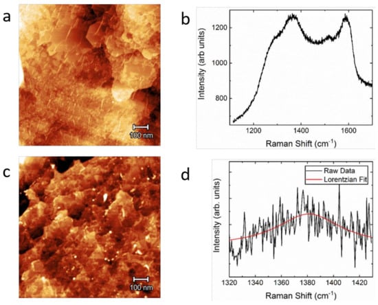 Characterization of early exposure of individual precursors. (a) AFM image of a triethylborane (TEB) pre-exposed sample. (b) Raman spectrum of a TEB pre-exposed sample. (c) AFM image of a NH3 pre-exposed sample. (d) Raman spectrum of a NH3 pre-exposed sample.