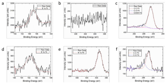 To better understand the above results, we explored the isolated exposure of either TEB or NH3 to the Ni surface (Figure 5). XPS of TEB exposure (Figure 5a,b) reveals the B 1s peak (~189 eV) with no trace of any nitrogen (~398 eV). From Figure 5c we can observe the presence of graphitic-like C bonding, which is in agreement with the graphitic carbon found in Figure 4 from the early TEB sample. Other groups have published on the formation of a B-Ni alloy layer which determined the resulting film thickness [33]. Based on the fitting of the XPS data in Figure 5d, we can confirm the claim that there is the formation of B-Ni bonding when the boron precursor is exposed to the surface alone. Somewhat interestingly, although no sign of B—N bonding is seen in the TEB-only sample, the same was not true for the NH3-only sample (Figure 5d–f). In this sample, we unexpectedly observe the presence of B even though no boron source was intentionally added during this growth process. From this, we can assume that the platter used to hold the substrates holds some non-zero amount of B (from previous runs, as the same platter was used for all samples) which became active during our precursor experiment and deposited on the surface of our sample in very small quantities as BN due to the presence of the nitrogen precursor NH3.