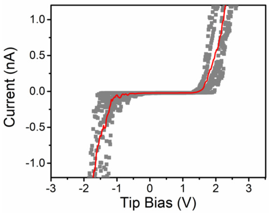 I-V curves from conductive-probe AFM (C-AFM) measurements. Curves in gray are from nine different measurements at three different spots on a sample. The red curve is the average of the gray curves.