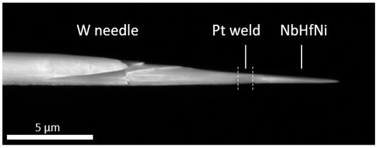 The specimens were prepared using the standard lift-out and mounting method [58] using a Plasma Focused Ion Beam “Helios G4 PFIB CXe” (Thermo Fisher Scientific, Eindhoven, Netherlands). A sample was first extracted from the Nb-Hf-Ni substrate by ion milling, using 30 kV Xe+ ions. It was welded to a micromanipulator using ion beam induced deposition of platinum, and sections of the sample were welded in the same way on tungsten needles. These specimens were subsequently sharpened with the Xe+ ion beam, using the annular milling method [58]. In order to minimize the thickness of the final damaged surface layer, the needles were then milled over ~100 nm using a 12 kV Xe+ ion beam. Using this method, Nb-Hf-Ni needles with a radius of curvature below 50 nm could be obtained (Figure 1).