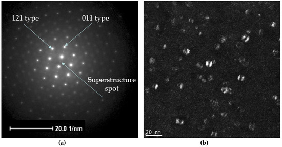 (a) BCC diffraction pattern with weaker superlattice spots. The orientation of the plane is (311). Brighter spots correspond to the Nb base BCC diffraction pattern plus precipitates, weaker spots only to the diffraction pattern of the precipitates. (b) Image of the particles based on the selection of a superlattice spot (dark field image). The two-hemispheric contrasts associated to each particle correspond actually to the strain field around the precipitates. The size of the precipitates is typically below 15 nm.