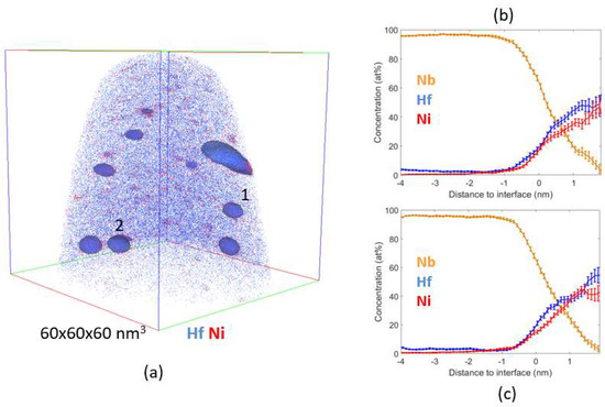 (a) Reconstruction of Figure 6b wherein isosurfaces were displayed for a concentration of Hf equal to 19%. This value was set empirically in order to allow the calculation of concentration profiles across these interfaces. (b,c) correspond respectively to the proximity histogram calculated along interfaces for precipitate 1 and 2 as shown in (a). In (b,c), the precipitate is on the left and the matrix on the right. The Hf/Ni relative concentration within the precipitates is comprised between 60/40 and 50/50.