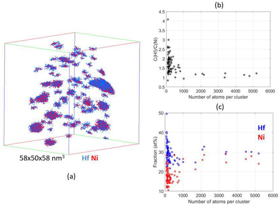 It should be pointed out that, as for the precipitates, the Hf/Ni ratio for large precipitates is comprised between 1.5 and 1 (Figure 8b): clusters (enriched in solute) appear thus clearly as germs for the formation of precipitates as they grow in size.