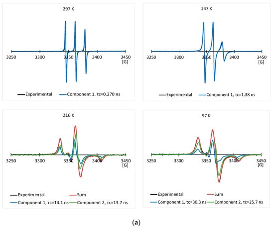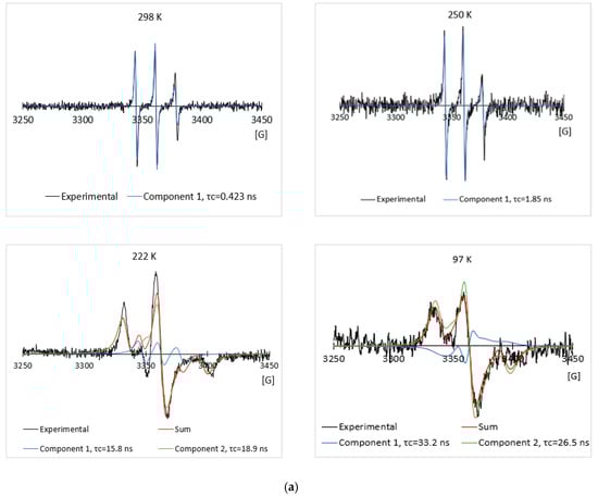 Rotational correlation times of the spin label, along with the component line-shapes, were calculated for each EPR spectrum. Theoretical simulations of the EPR spectra of the spin-labeled peptides were performed using the Multi-Component EPR Fitting program (version 742) and LabVIEW software. This EPR simulation program was developed by Dr. Christian Altenbach (University of California, Los Angeles, CA, USA) [54,55,56].