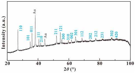 We started our experiment by synthesizing ε-FeOOH from goethite (α-FeOOH, CAS: 20344-49-4). Goethite comprises double chains of edge-shared octahedra that form 2 × 1 channels hosting hydrogen bonds at an ambient condition. Above 5 GPa, it transforms to a high-pressure phase of ε-FeOOH, which consists of corner-shared single bands of octahedral. ε-FeOOH is thermodynamically stable in cold subducted slabs [25]. It is quenchable to ambient conditions once the crystal is synthesized in a multi-anvil press [26,27]. We followed the recipe by Suzuki [26,27] by compacting goethite powder in a gold capsule, rolling in a rhenium heater, and placing it in a Kawai-type multi-anvil press at the Geophysical Laboratory, Carnegie Institution of Washington. The use of the gold capsule was to seal water from out-of-capsule diffusion. The ε-FeOOH sample was synthesized at 10 GPa and 800 °C for 4 hours. After quenching to ambient conditions, the recovered samples were examined and confirmed on a diffractometer (Figure 1). The lattice parameters and volume at ambient conditions of the synthesized ε-FeOOH phase (orthorhombic, P21nm) were listed in Table 1 when compared with ε-FeOOH synthesized in other laboratories [26]. We found the ambient lattice parameters of our sample were consistent with other studies, which confirmed the composition of the synthesized ε-FeOOH was fully hydrogenated.