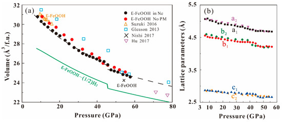 - Suzuki, A. Pressure–Volume–Temperature Equation of State of ε-FeOOH to 11 GPa and 700 K. J. Miner. Petrol. Sci. 2016, 111, 420–424. [Google Scholar] [CrossRef][Green Version]