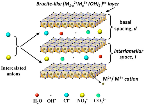 Schematic view of the M2+M3+ LDH general structure, with Cl−, NO3− and CO32− anions intercalated in the brucite-like structure. Other possible chemical species eventually present in the interlamellar space are reported, i.e., hydroxyl groups and interlayer water molecules. The figure is reprinted from Ref. [24] under a Creative Commons Attribution Non-Commercial No Derivatives License (CC BY-NC-ND).