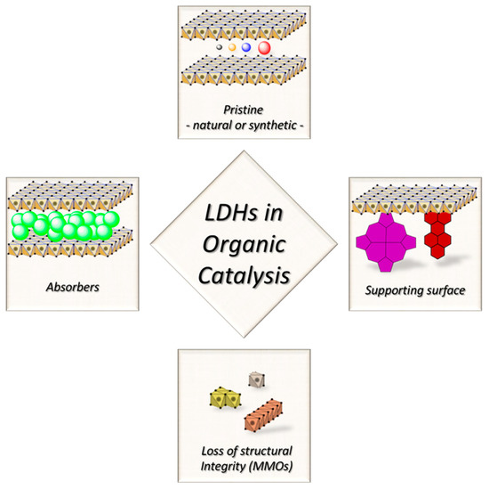 Chemists’ interest over clays does not go so back in time: early in the 80s the works of Kruissink and Reichle on methanation [25] and acetone oligomerization [26], respectively, pointed out that LDHs could be employed as precursors for catalytic species, after thermal degradation. In those works, the properties of the pristine LDHs were not addressed, but shortly after Martin and Pinnavaia revealed how LDHs could be useful also in their pristine form [27]. From there on, the number of publications on catalytic LDHs quickly grew. The aforementioned paper not only had a historical relevance, but it allows us to discuss the different strategies that researchers have when dealing with LDHs as catalysts (see Figure 2):