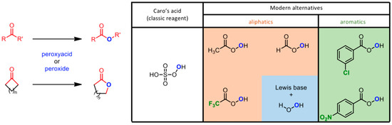 The Baeyer–Villiger (BV) reaction (see Figure 3) is an oxidative pathway bringing to the formation of esters and lactones by oxidation of carbonyl compounds with a peroxide derivative [64]. The reaction takes the name of its two developers, Adolf von Baeyer (previously known for the synthesis of indigo) and his student Victor Villiger, reporting the use of Caro’s acid (KHSO5) as a new oxidant for the conversion of cyclic ketones to the corresponding lactones [65]. This versatile protocol was revised in the last century of applications [66]; the interest towards this reaction increased when the work by Fried et al. provided the first definitive evidence of lactone formation in living organisms according to the Baeyer–Villiger pathway [67]. Moreover, the enzymatic B-V oxidation was also explored to facilitate biotransformation of sterically demanding ketones [68]. These evidences opened the way to the search of new oxidants, with major urge in the last 20 years due to the necessity of greener protocols [69,70].
