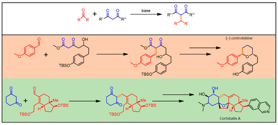 The Knoevenagel condensation (see Figure 4) is one of the most diffused tools in the hands of organic chemists. Such versatile reaction can be briefly defined as the product of interaction between a carbonyl compound (aldehyde or ketone) and any compound having an active methylene group. When we say active, we mean that the presence of ancillary electron withdrawing moieties (nitro, cyano, or acyl group) weakens C-H bonds in close proximity. The reaction terminates with a dehydration reaction in which a molecule of water leaves the molecular skeleton. The primary product of a Knoevenagel reaction is usually an α,β-unsaturated ketone [80]. The Knoevenagel condensation is frequently used when building biologically active scaffolds, and it finds application in the synthesis of several biologically-active molecules [81], such as steroids [82].