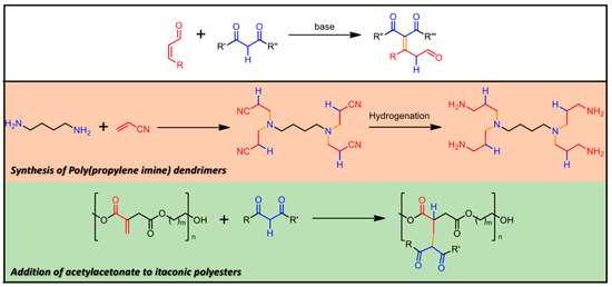 Michael Addition Reaction General Scheme. Middle and bottom: examples of some industrially relevant materials, whose synthesis takes advantage of Michael Addition. In evidence, the newly formed chemical bond (orange) and the residues belonging to the starting carbonyl (red) and 1,3-diketo (blue) moieties.
