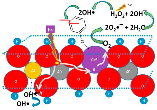 Proposed photocatalytic mechanism for the cerium presence in ZnAl LDH materials and its role as charge separator. Adapted from Reference [131]. Copyright 2016 Elsevier.