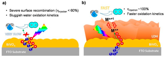 Schematic representation of charge carrier dynamics in water oxidation on BVO (a) and BVO/CMZ-LDH (b) photoelectrodes. Adapted from Reference [141]. Copyright 2019 Elsevier.