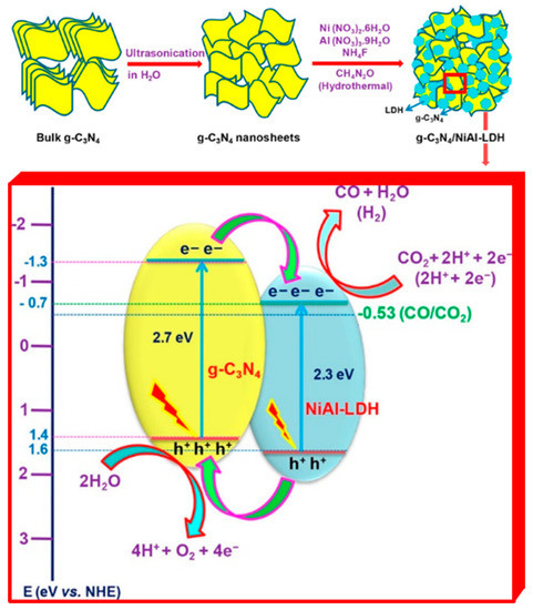 Another example calls back what was already described for LDH application in water splitting reaction. The work from Tonda et al. exploited the possibility to take advantage of a two-component hybrid combining g-C3N4 with LDHs [152] (see Figure 9). In the present case, a detailed characterization and description of the photocatalytic mechanism in the g-C3N4/NiAl-LDH heterojunction culminated in the observation of a CO production rate 5 times higher than that of pure g-C3N4, and 9 times higher than what was revealed for pure NiAl LDHs.