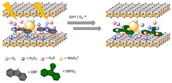 In this section, a couple of interesting papers focusing on other relevant topics are discussed. In the previous Section, several words have been spent over transesterification as an important route to produce biodiesel. Again, LDH materials are used, as well, in photocatalytic applications close to the petroleum chemistry, as Gao et al. reported [153] (see Figure 10). LDHs were employed in the mitigation of polluting emissions of diesel oil, mostly related to the high concentration of sulphur-containing hydrocarbons [154]. Their LaZnAl-MoO4 LDHs were reported to promote desulfurization of diesel oil under UV irradiation, favoring the oxidation of dibenzothiophene (DBT) to the corresponding sulphone. The conversion rate, based on the quantity of sulfone that remained adsorbed to the LDH surface, was determined as being up to 84% in 1 h.