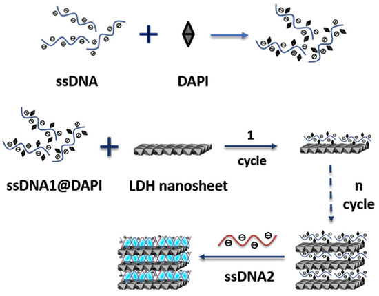- Haroone, M.S.; Hu, Y.; Zhang, P.; Ma, R.; Zhang, X.; Kaleem, Q.M.; Khan, M.B.; Lu, J. Fluorescence enhancement strategy for evaluation of the minor groove binder DAPI to complementary ssDNA sequence including telomere mimics in (ssDNA@DAPI/LDH)n ultrathin films. Dyes Pigments 2019, 166, 422–432. [Google Scholar] [CrossRef]