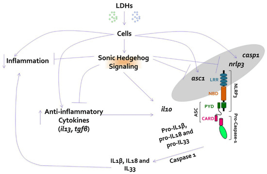 - da Silva Feltran, G.; da Costa Fernandes, C.J.; Rodrigues Ferreira, M.; Kang, H.R.; de Carvalho Bovolato, A.L.; de Assis Golim, M.; Deffune, E.; Koh, I.H.J.; Constantino, V.R.L.; Zambuzzi, W.F. Sonic hedgehog drives layered double hydroxides-induced acute inflammatory landscape. Colloids Surf. B Biointerfaces 2019, 174, 467–475. [Google Scholar] [CrossRef]