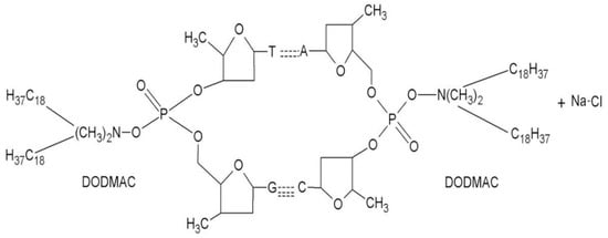 DNA structure with a surfactant DODMAC, where: A, T, G and C—four nitrogen-containing nucleobases and hydrogen bonds bind the nitrogenous bases of the two separate polynucleotides.