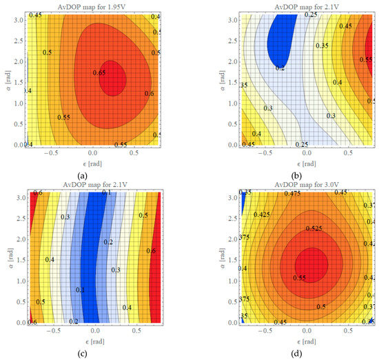 Analyses of plots presented in Figure 4a show that both tested elements have relatively high values of AvDOP parameter because the minima are of around 0.35 and it is far from the measured DOP presented in Figure 3. However, information about AvDOP gives general information on how strong attention needs to be taken to apply proper voltage to a known input SOP or how to tune voltage to minimize DOP if input SOP is unknown. Unfortunately, anisotropic properties of depolarization of tested samples presented in Figure 4b in this form do not allow to apprehend if high or low value of Add is preferable or not for this device. Therefore, following the method presented in [31], the 2D map of AvDOP as a function of input SOP parameters α and ε is shown in Figure 5. Voltage values selected for these plots were taken as minima of linear and circular input SOPs, respectively.
