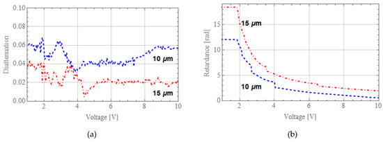In the next step of the analysis the polar decomposition defined by relations (1) was used to extract information about dichroism and birefringence of the tested PVAN cell. Voltage changes of representative, cumulative parameters for mentioned above effects as diattenuation and retardance [30] are presented in Figure 6.