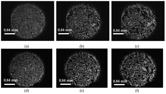 Microphotographs of 2050 LC domains on the DODA biofilm observed under crossed polarizers for input linear horizontal SOP and under voltage of 2.15 V applied to the cell in three time intervals of the samples with thickness of 10 μm after (a) 25 s, (b) 150 s (c) 300 s and 15 μm after (d) 25 s, (e) 150 s, (f) 300 s.
