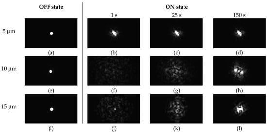 To study the light scattering capability of the cells with thickness of 5 μm, 10 μm and 15 μm, Fourier transform of scattered light has been adopted. This method has been developed as a sensitive one for studying this effect from inhomogeneous and dynamic structures [36]. The samples were illuminated using a parallel beam of He-Ne laser and placed behind the lens at a certain distance from the focal plane. We applied to each sample a voltage corresponding to minimum (DOP); V = 2.65 V, 2.15 V and 2.15 V in the case of 5 μm, 10 μm and 15 μm, respectively. We recorded the images of the scattered beams that are detected by CCD camera placed at Fourier plan after different times’ lag detection. Figure 9 shows images of spectral intensities’ distributions of the focused beams after switching ON of the cells with voltages corresponding to the DOP minimum. The small angular scattering distribution has been detected in Fourier plane where the beam profile differs from the focused condition in OFF state (Figure 9a,e,i) showing beam spot spreading. As results of a spatial and temporal changes of refractive index distribution due to annihilation of umbilical defects, a spatial reshaping of the beam spreading changes with time. Significant changes of the beam reshaping with time are observed in thicker cells (10 and 15 μm). However, in a thin cell of 5 μm, no significant changes in light spreading is observed. Correlation of scattering properties of the studied cells with their dynamic change of spatial refractive index distribution, thickness effect and temperature dependence will be a subject of a further study.