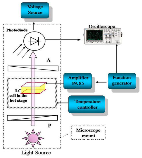 With the rapid pace in technological advances and the widespread deployment of optical networks over the past few years, fiber-optic communications have a significant role due to their higher bandwidth and greater reliability than copper cables [1,2]. The demand for unlimited band width encourages the generation of novel technologies to make networks much faster, more reliable, and more scalable [3,4]. In transparent optical networks, bit-error-rate (BER) largely depends on intensity of cross-talk. To achieve low BER (10−9), required cross-talk is <−30 dB [5]. For a high bit rate transmission, optical switches are essential and this transmission must be matched with the switching capacity. All-optic switch fabrics allow switching directly in to the optical domain to avoid electronic bottlenecks. The high cross-talk and slow response time are, therefore, serious issues to be overcome in the fast growing communication networks. Development of power-efficient, low cross-talk, and much faster optical switches is crucial in tackling this problem. The optical switch performance can be assessed by measurement of the transparency to bit rate and data format, scalability, insertion loss, and cross-talk. In photonic switches, to control the properties of optical signals, it is most effective to use materials such as LiNbO3 [6], semiconductor optical amplifiers (SOA) [7,8,9], liquid crystal (LC) [10,11], etc., which can change their refractive index upon photo irradiation. Among the materials, LCs exhibit large optical anisotropy, and a large change in refractive index by changing their alignment, which is obviously advantageous for photonic applications [12,13]. Due to the permanent electrical dipole moment, molecules can take up a certain mean relative orientation in the LC phase. It is possible via the application of suitable electric field across a LC cell to act on the orientation of molecules, and thereby alter the optical properties of the material [14,15,16,17,18,19,20]. LC optical switches are based on the change of polarization state of incident light by LC as a result of an external electric field. The change of polarization with polarization-selective beam splitters offers optical space switching.