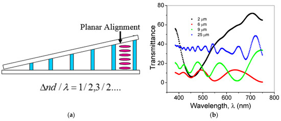 The wedge cell was placed on a hot stage under crossed polarized states and the light transmission through the cell was measured using an Avaspec spectrometer, which provides accuracy of wavelength better than 10%. The empty cell thickness (Figure 2b) was measured from the interference fringes reflected from both glass substrates, and is calculated as