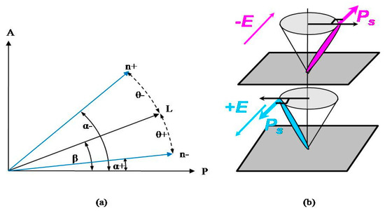 In sufficiently thin samples, a homogeneously polarized ferroelectric state can be switched under the application of an electric field. FLC acts as a dielectric in a transparent capacitor. The applied voltages across the capacitor plates produce linear electro-optical switching of the polarization and tilt and also principal optical axis switching. The optical axis for an FLC is determined by n and the molecule can be switched between two stable states with a relative angle θ. Two molecular orientations are possible with respect to the polarization in the SmC* phase, and can be seen in Figure 3b. The net spontaneous polarization (P) appears in the direction perpendicular to the smectic layer plane. The switching can be easily observed between crossed polarizers. Due to the birefringence of the cell, the ordinary and extraordinary waves travel at different speeds through the cell and interfere at the output. The molecules can be switched by the application of electric field in the direction perpendicular to the surface. When the direction of spontaneous polarization is reversed by the external electric field then the optical axis therefore changes its orientation by twice the tilt angle.