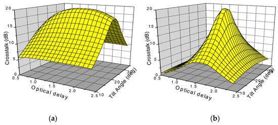 The K+ and K||‘ are the contrast ratio of both crossed and parallel polarized states. As cross-talk is 10 log (1/K), we have simulated the cross-talk (CT) using Equations (5a) and (5b), also shown in Figure 5.
